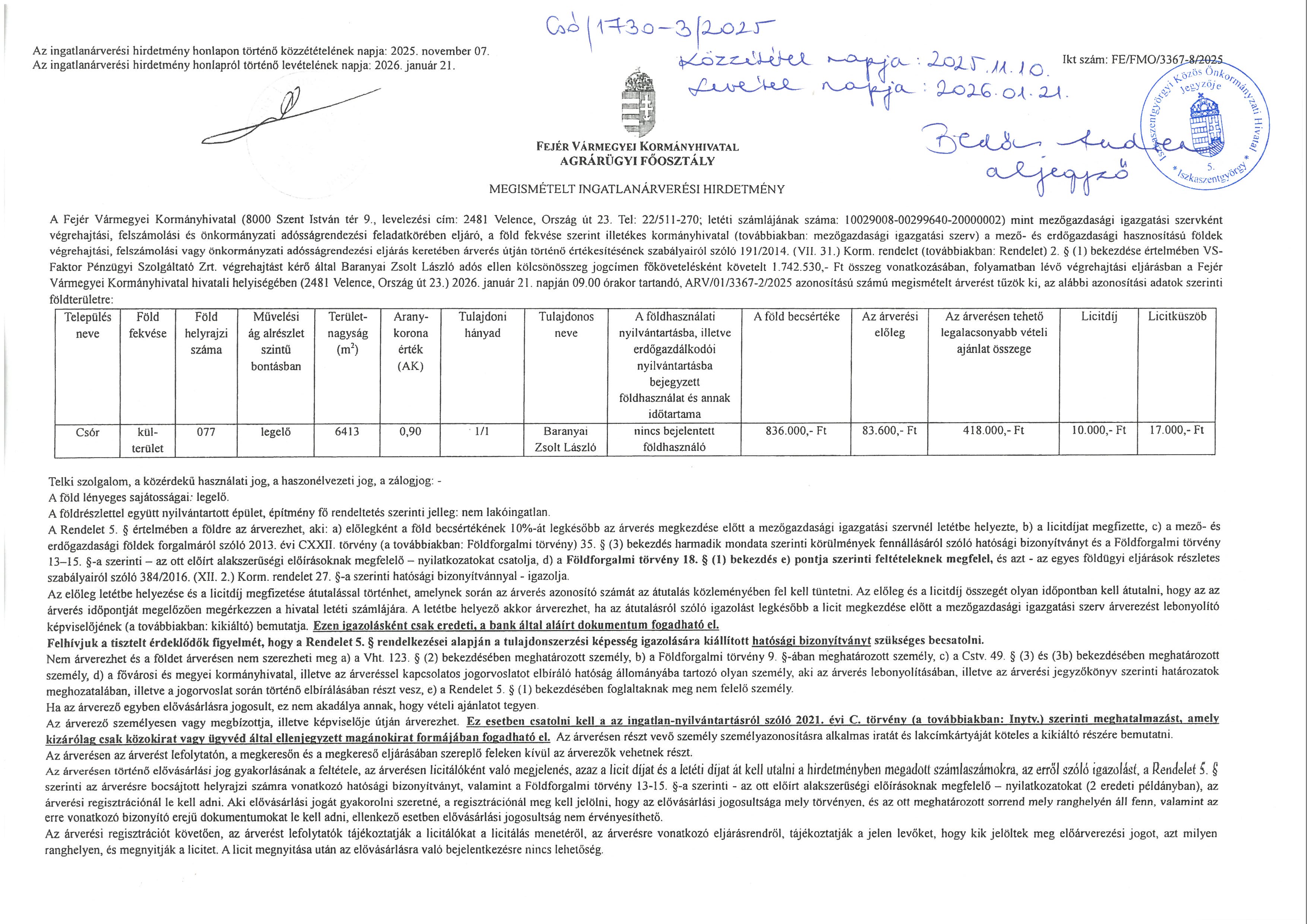 2025. november 10, 15:46 hétfő / nyomtatás Ingatlanárverési hirdetmény Ingatlanárverési hirdetmény - Csór, külterület 077. hrsz., legelő