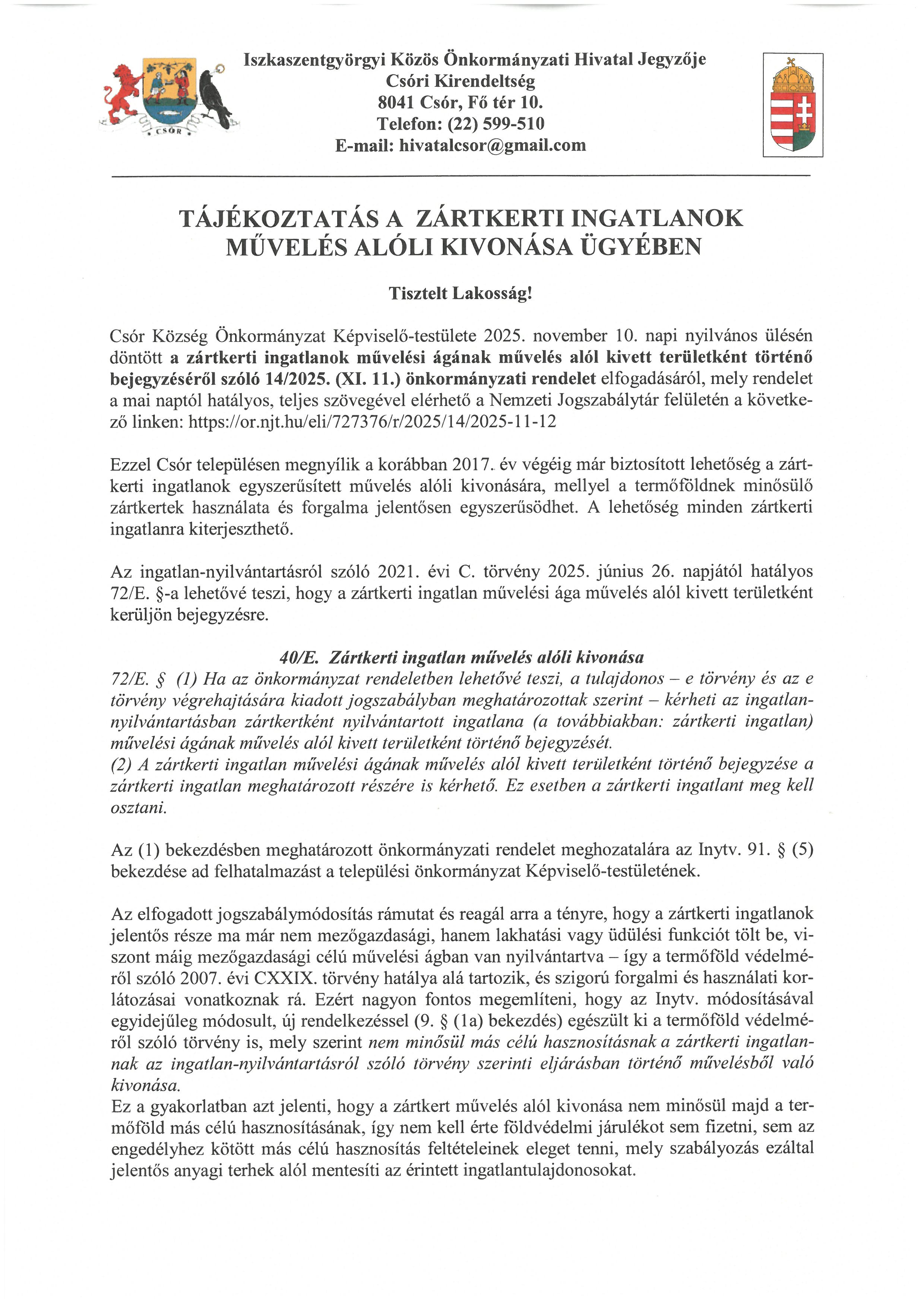 Tájékoztatás zártkerti ingatlanok művelés alóli kivonása ügyében